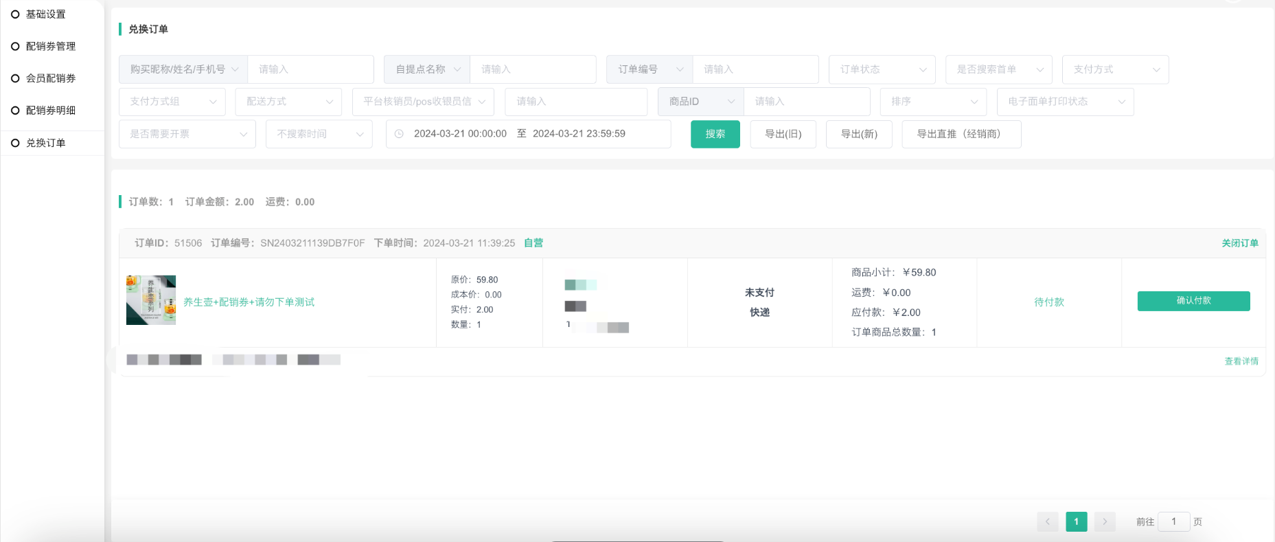 6、前端订单下单了(即提交订单未支付)就会显示配销券已使用,商城后台需要订单支付成功了才显示。订单关闭/订单退款关闭配销券会返还.