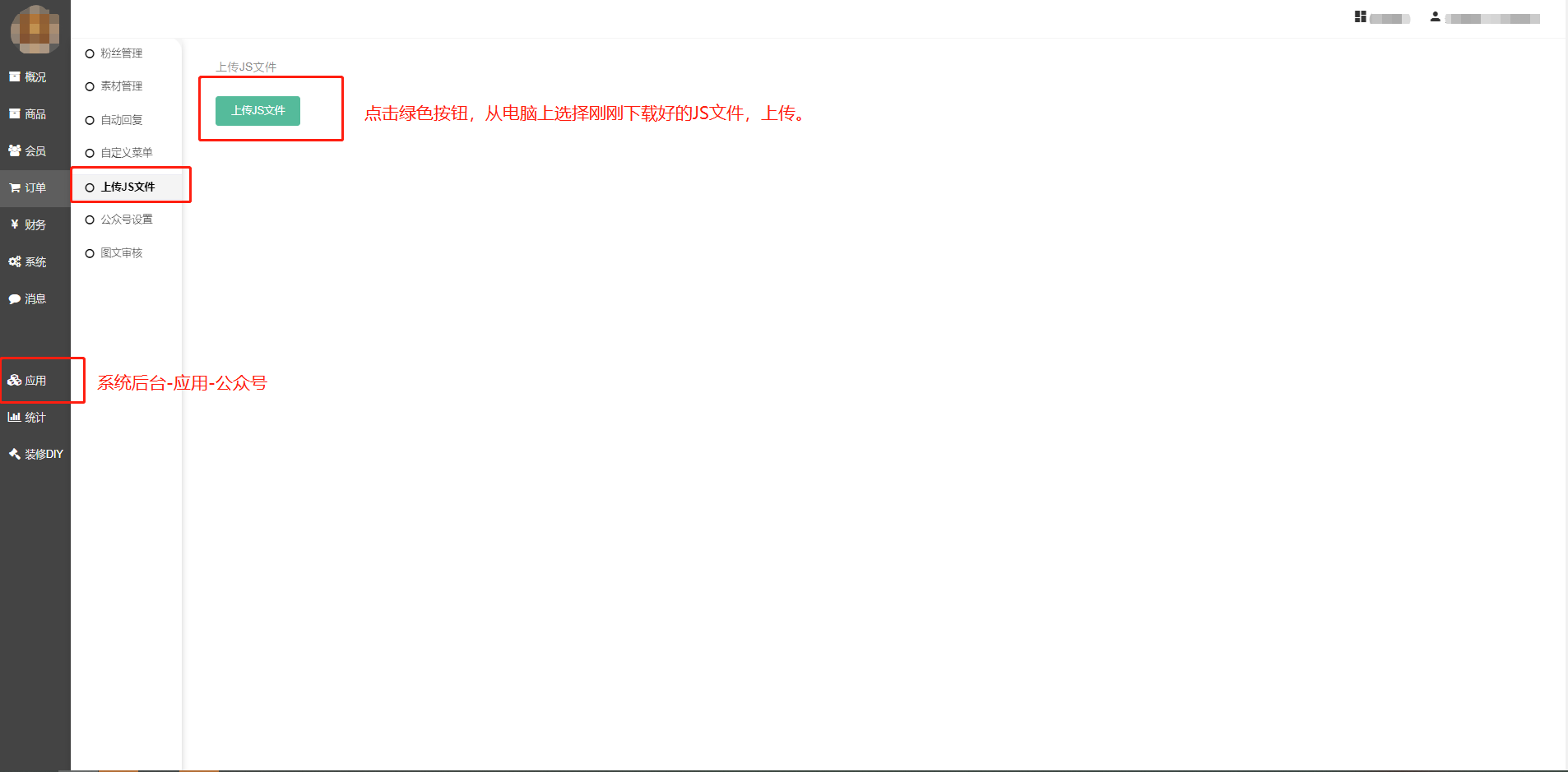 4:登录我们系统-应用-公众号-上传JS文件处上传JS文件。