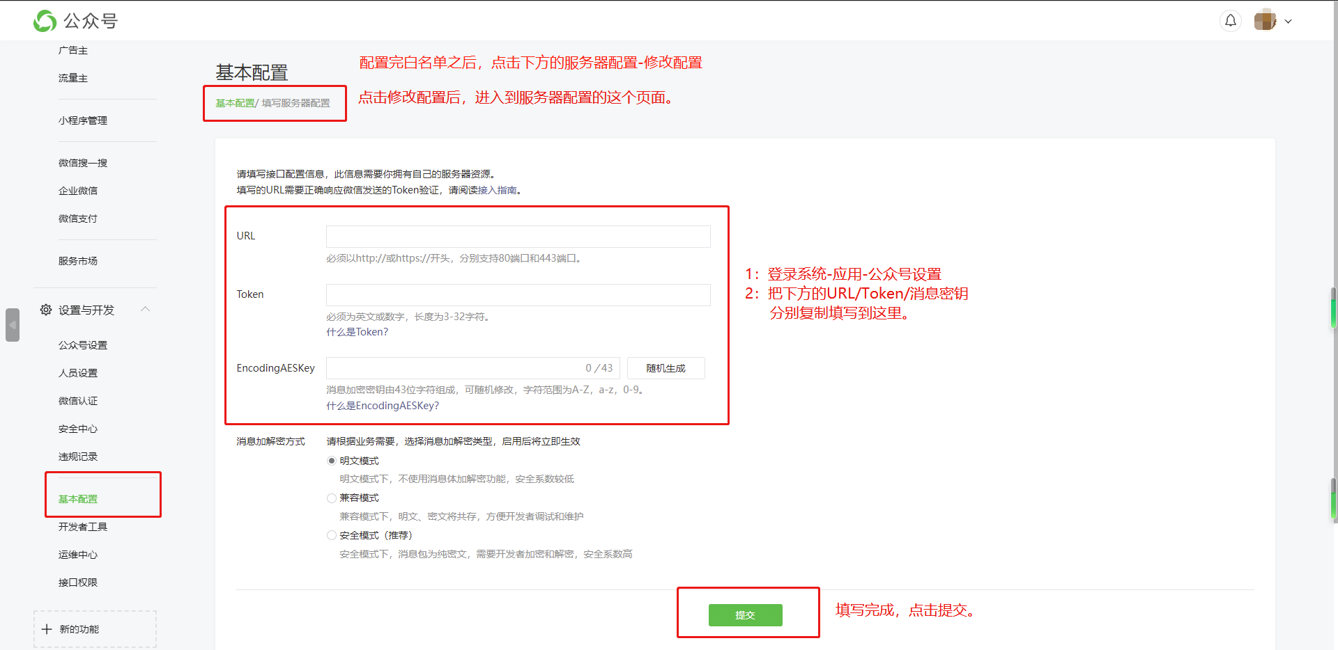 2:点击基本配置,填写开发信息和服务器配置,先设置好密钥、白名单再进行服务器配置。