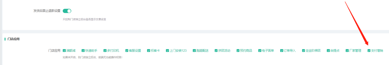 2、勾选后门店独立后台应用页面显示支付营销入口